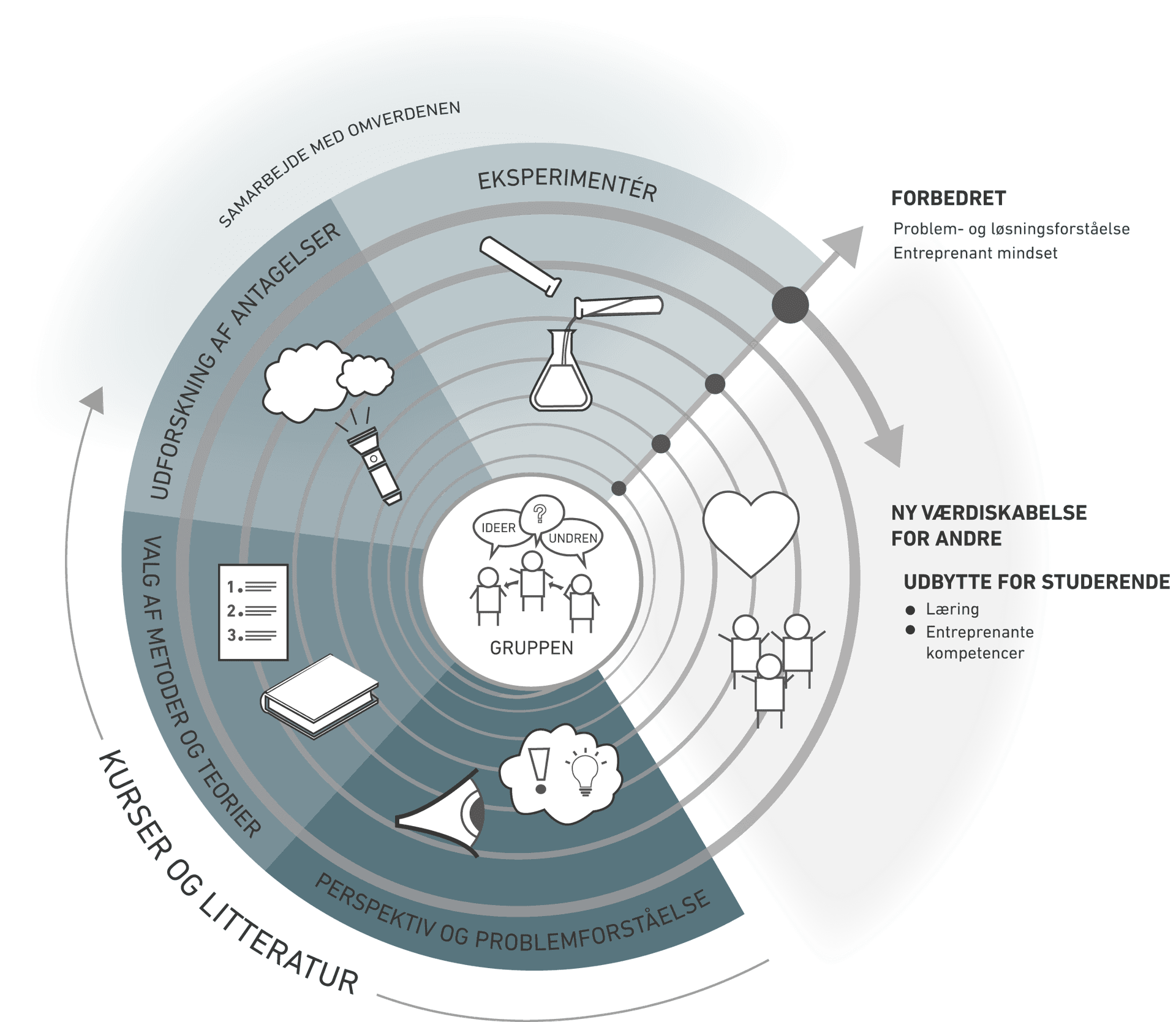 Jeg beskriver en konkret studiegruppes læringsrejse i det følgende. Heri inddrager jeg Entreprenørskabs - PBL’s læringshjul, som jeg uddyber herunder.