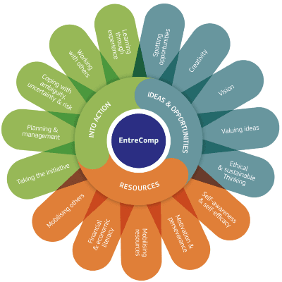 I denne definition er entreprenøskabskompetencer en samlebetegnelse, som er knyttet til handling, ressourcer og det at få ideer og udnytte muligheder.